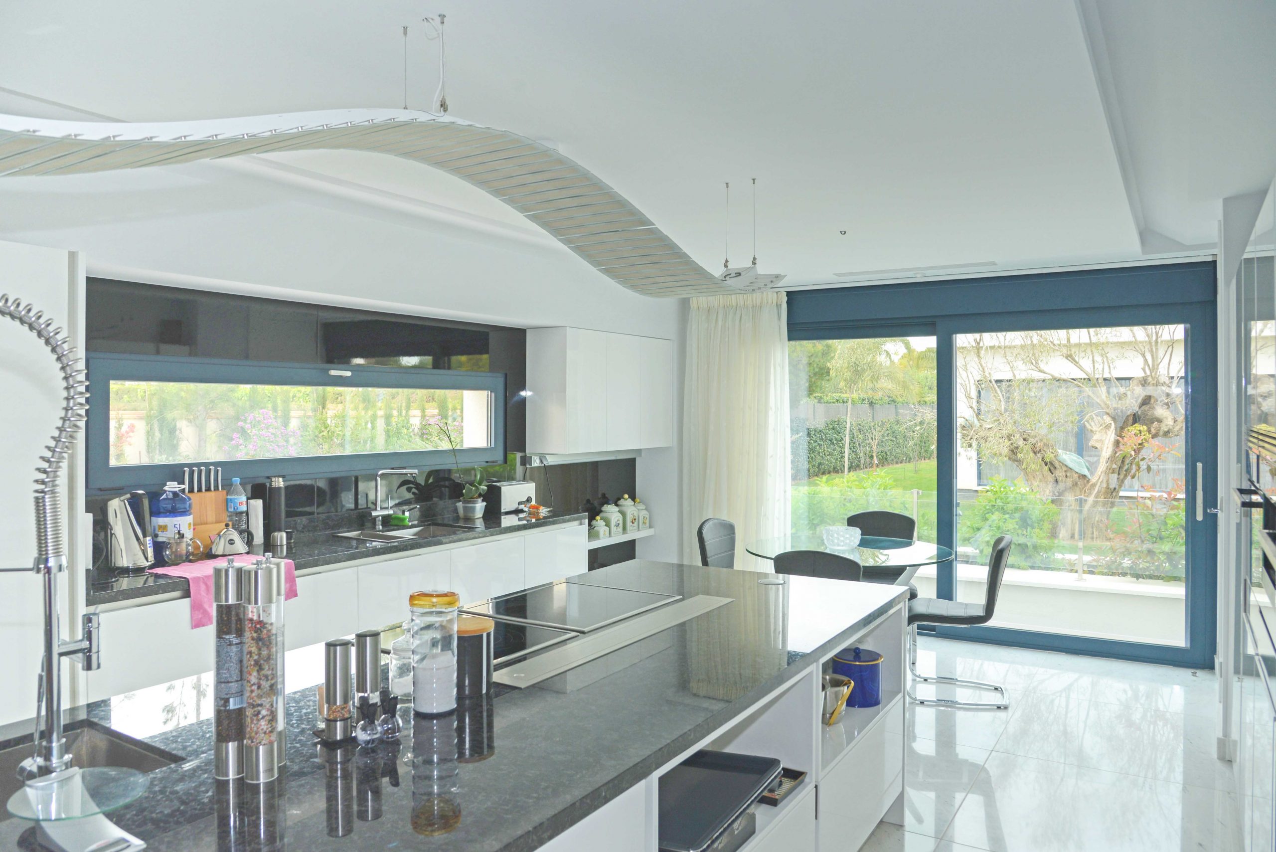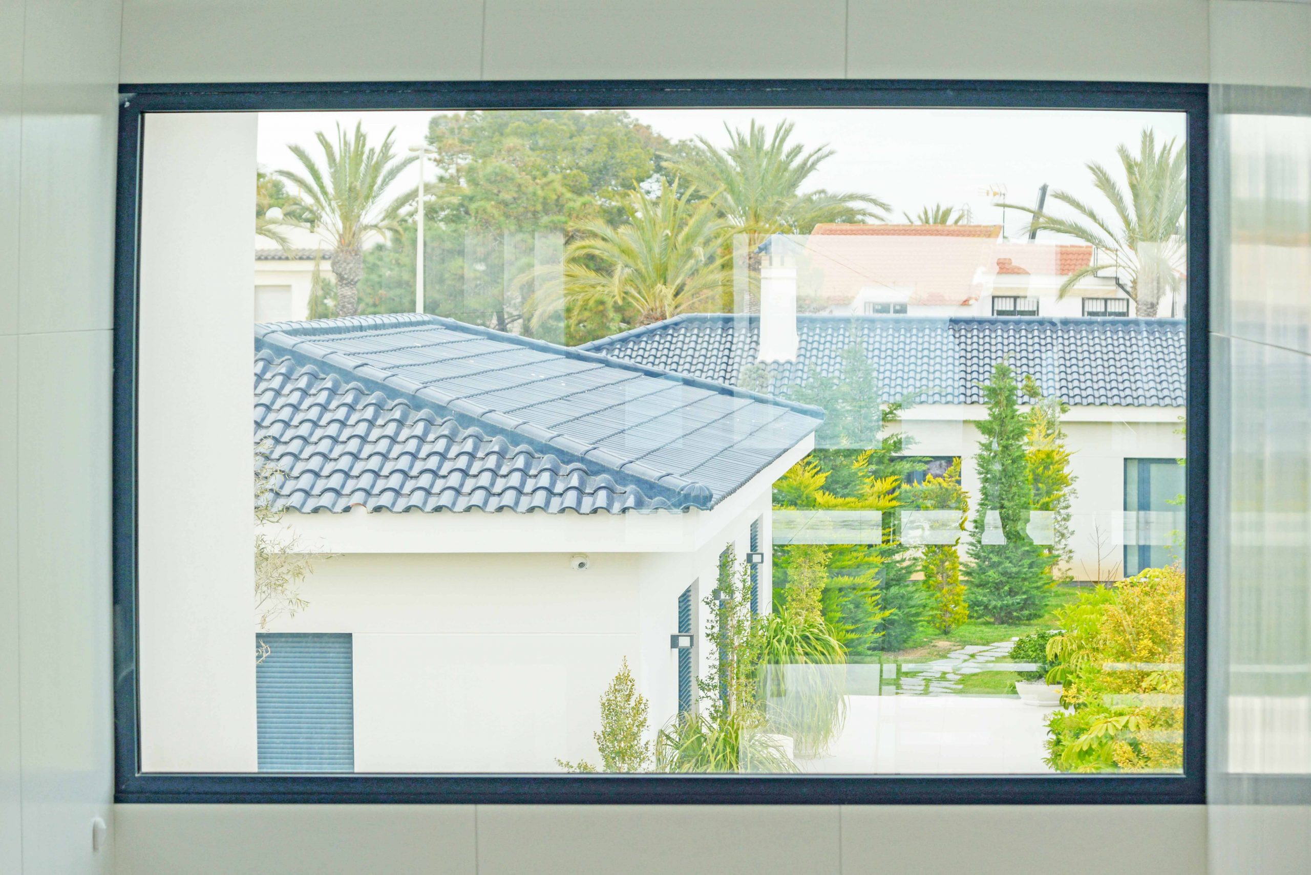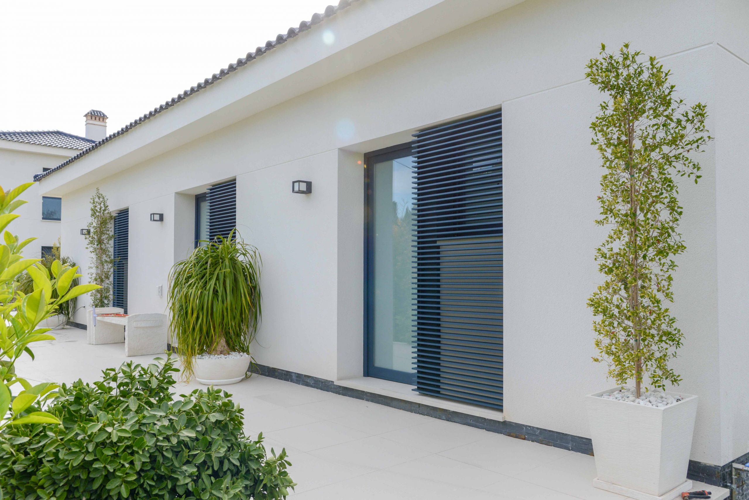 Las ventanas de esta vivienda unifamiliar en Orihuela Costa son de aluminio de la marca Schuco de color Antracita con sistemas elevables y abatibles de 80 mm de fondo de la máxima calidad.